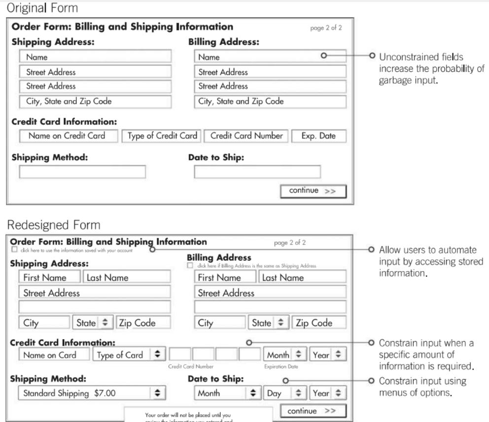 As a single example, forcing customers to enter telephone numbers without normal spacing or punctuation saves a single line of code and a handful of machine cycles. It also results in a lot of incorrectly captured phone numbers. (That’s exactly why phone numbers are broken up into smaller pieces.)