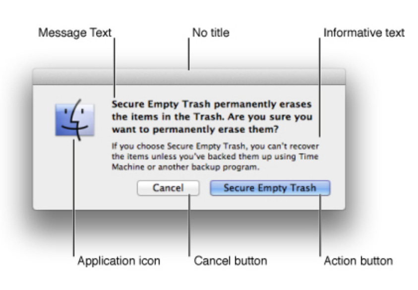 Apple's Human Interface Guidelines expand on this even further, recommending multi-word verbs instead of "OK" or "Yes" buttons, and clearly defining the suggested regions for an alert box: